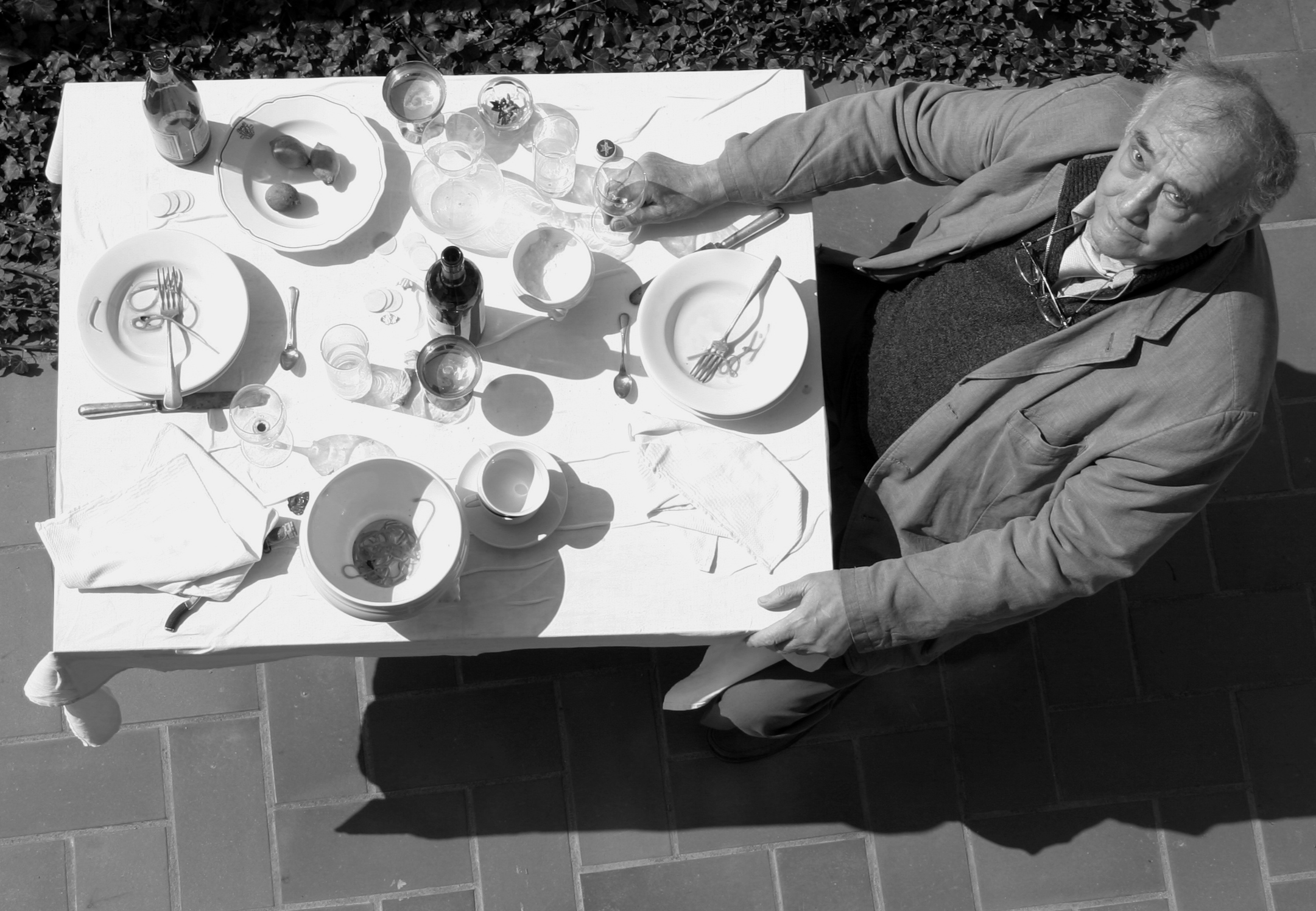 Das kommt vielleicht auch aus diesen Kriegserinnerungen, wo wir nicht genug zu essen hatten. Ich habe aber, muss ich dazusagen, nie gehungert, auch weil ich ein Schlaumeier war, der ja im Krieg nicht in die Schule ging und Zeit hatte, mit einer kleinen Bande zu Bauern zu gehen um dort ein paar Kartoffeln zu erbetteln. Ich bin auch kein Maler und es ging mir nie um Aktzeichnen oder Landschaftsmalerei. Ich habe die ersten Tische für meine Fallenbilder aber nicht etwa aufgeklebt, um Essen zu zeigen, sondern ich dachte an Kasimir Malewitsch, also an Formen, Kreise usw. die sich auf eine unbewusste Art auf einer Fläche bewegen. Die Ordnung des gedeckten Tischs weicht einer Unordnung, weil man nach dem Essen ja nicht schaut, wohin man die Gabel legt. Diese unbewusste Ordnung hat mich interessiert.
