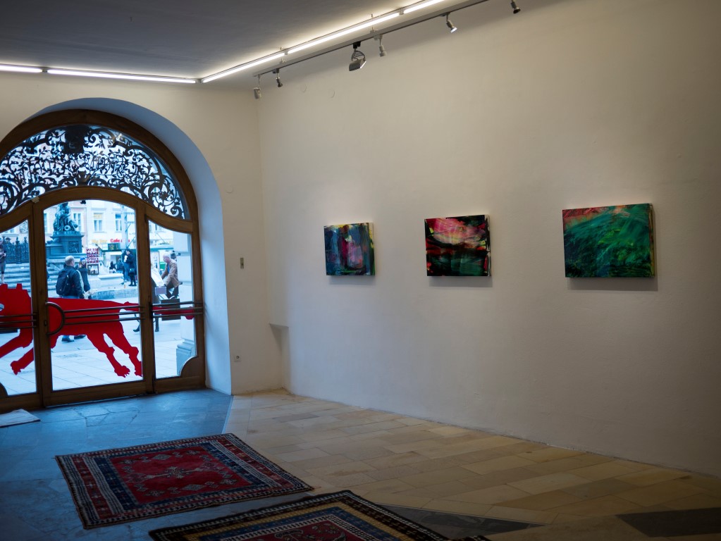 Unsere Arbeiten wurden schon aufeinander abgestimmt. Es funktioniert ja nicht alles miteinander. Meine großformatige Malerei würde die ganz feinen, gitterartigen Dinge, die den Raum durchschneiden, einfach verschlucken. Es braucht hier Weite, um die Grafik sichtbar zu machen. Aus diesem Grund habe ich mich für kleine Formate entschieden, die aber dennoch bunt und kräftig sind. Sie lassen Platz für die Grafik im Raum.