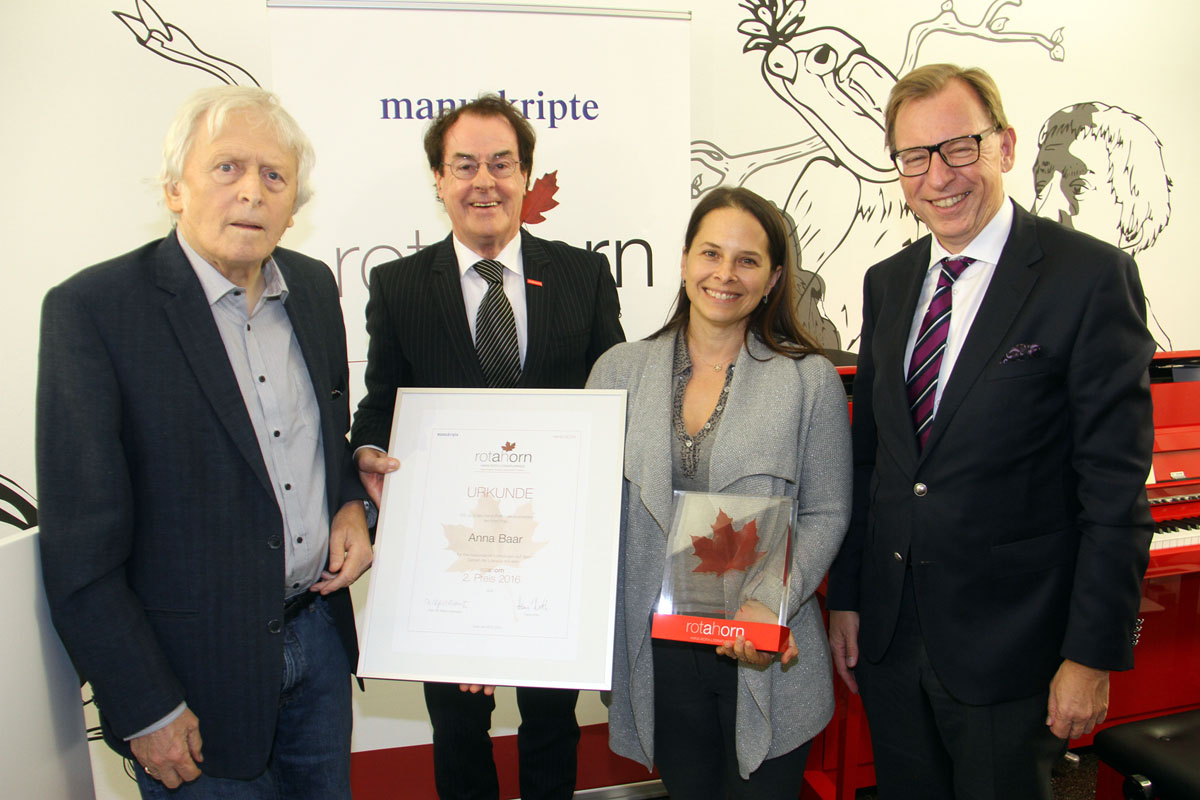Der „rotahorn Literaturpreis“ wurde im feierlichen Rahmen in der Steiermärkischen Landesbibliothek von Kulturlandesrat Dr. Christian Buchmann an die Preisträgerinnen Ingeborg Horn und Anna Baar vergeben. Der von Mäzen Hans Roth gestiftete und in enger Zusammenarbeit mit der Literaturzeitschrift „manuskripte“ ausgelobte Preis wurde damit bereits zum sechsten Mal an steirische Literaten verliehen.