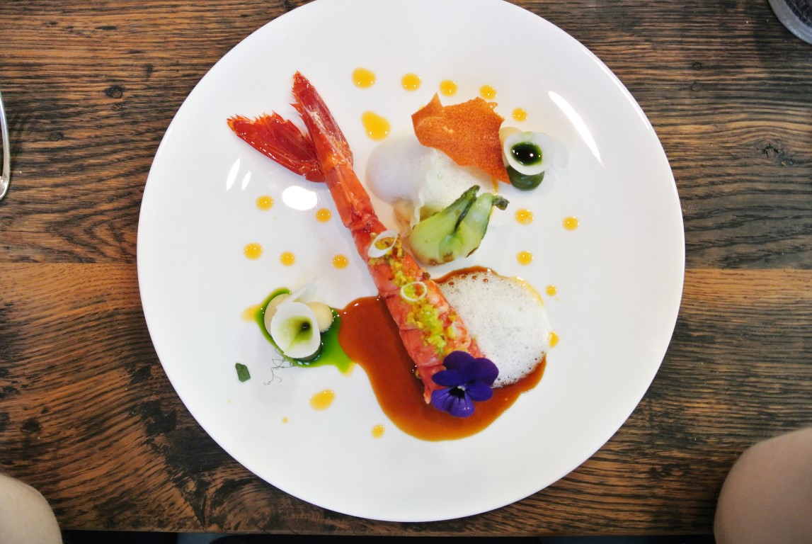 Als Nächstes wird der Rote Gamebroni serviert, für uns einer der subjektiven Höhepunkte des Menüs. Alleine diese Farbe, mit welcher der Schwanz des Krustentiers besticht, erfüllt den „Scampi-Fan“ mit Glückseligkeit. Das Prachtexemplar wurde bei 52 Grad pochiert und anschließend in Hummerbutter kurz angebraten. Seine Konsistenz ist himmlisch. Zu seiner Seite gibt es ein Dim Sum, versteckt unter einem Schaum aus Jasmin-Reis, gebratenem Baby-Pack-Choi und Aromeninseln mit grünem Curry, in Creme-Form auf Basis von Mandeln und Kokosmilch. Jede Komponente am Teller verkörpert den Urgeschmack des Produktes. Sagenhaft.