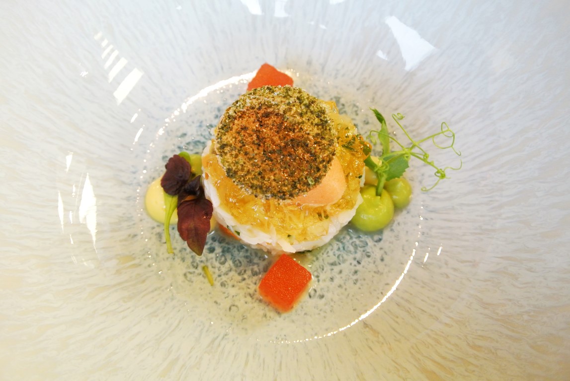 Der darauf folgende Taschenkrebs mit Dashi & Wassermelone lässt bereits erahnen, zu welcher Größe das Menü auflaufen wird. Das kleine Gericht zählt zu Baus ersten Signature-Dishes, mit dem er seinen „Bau-Stil“ erschaffen hat, und war ursprünglich als Hauptgericht konzipiert. Der ohnehin herrliche maritime Geschmack des Krustentiers aus der Normandie wird durch die Dashi-Aromatik regelrecht verzaubert.