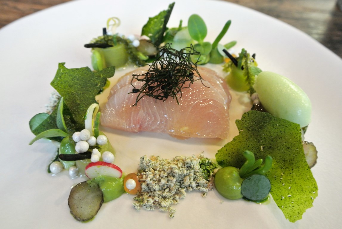 Der Star dieses Tellers, die Gelbflossenmakrele, wird eigens vom Tokioer Fischmarkt nach Salzburg eingeflogen. Gut 60 bis 70 % des Fisches werden beim Filetieren zum „Abfallprodukt“, das anderwärtig verarbeitet wird. Übrig bleibt das Beste vom Besten, was man für ein Sashimi bekommen kann. Eine solche Konsistenz und ein solches Aroma im Mund zu haben, ist schlicht Luxus. Bis zu diesem vollmundigen Moment hatte man bereits vier Grüße aus der Küche erlebt, die so aufwendig waren, als wären sie direkt aus dem Wunderland entsprungen. Man findet sich bei Christian Bau, aus kulinarischem Blickwinkel betrachtet, in einer anderen Welt wieder.