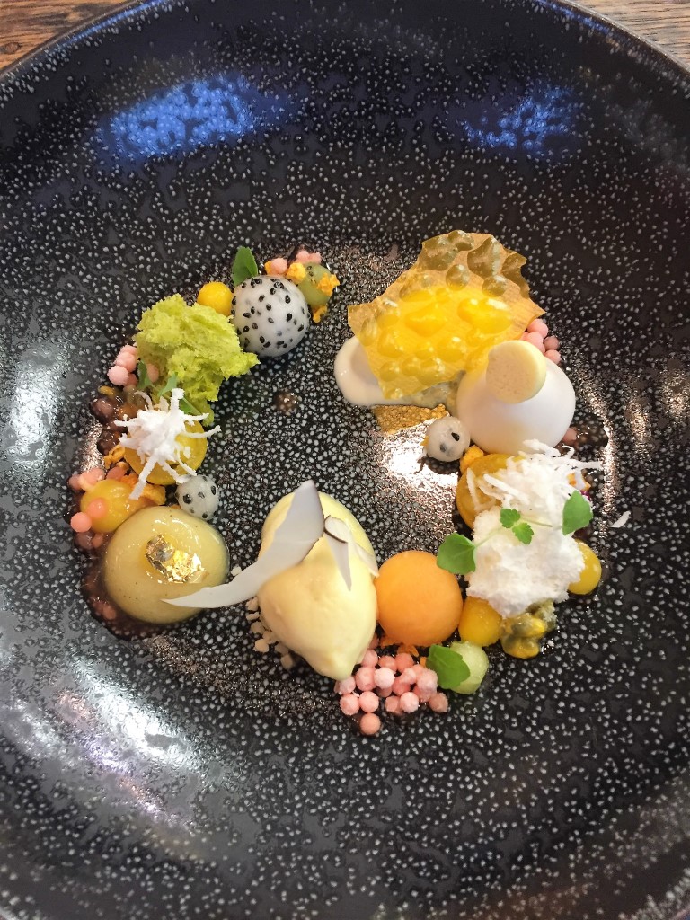 Auch die Desserts fügen sich ins Konzept. Sie sind leicht, aber dennoch von großer aromatischer Durchschlagskraft. Zuerst gibt es Multivitamin, gesunde, exotische Früchte in Textur.
