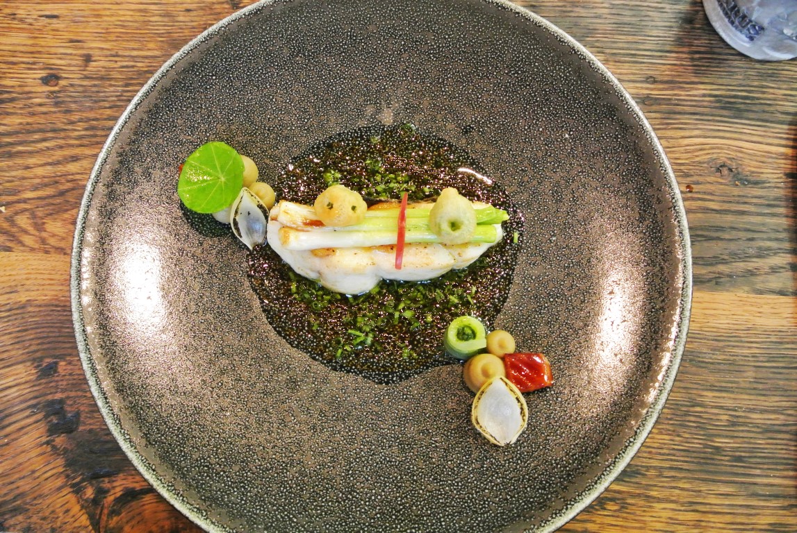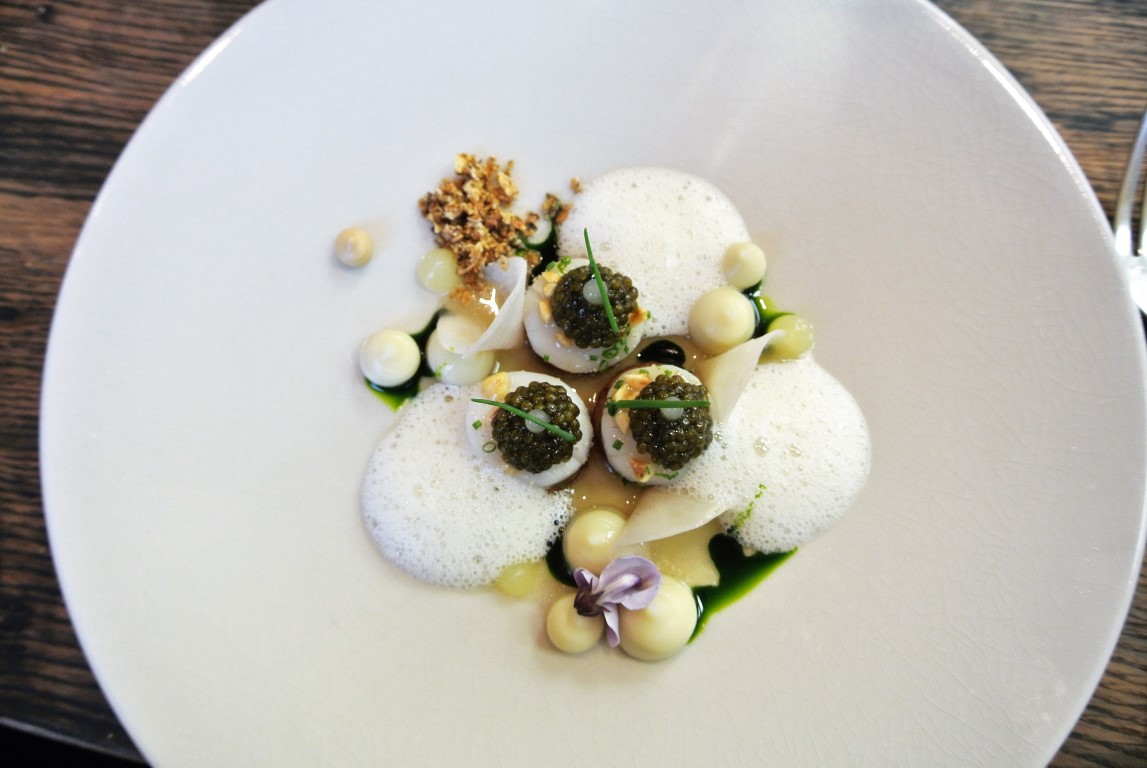 Die ersten Teller lassen die Freude auf unvorstellbare Steigerungsmöglichkeiten wachsen. Was kommt als nächstes? Coquille Saint-Jacques, Baus Version der Jakobsmuschel. Veredelt mit Topinambur, Zitrus und Osietrakaviar. Die Muscheln werden auf niedrigster Temperatur gegart und kommen fast roh auf den Teller. Die Süße der „Erdartischocke“ entpuppt sich als zuvorkommender Begleiter, der das Aroma der Muschel wunderbar zur Geltung bringt und es um eine ungewöhnliche Nuance ergänzt. Großartig.