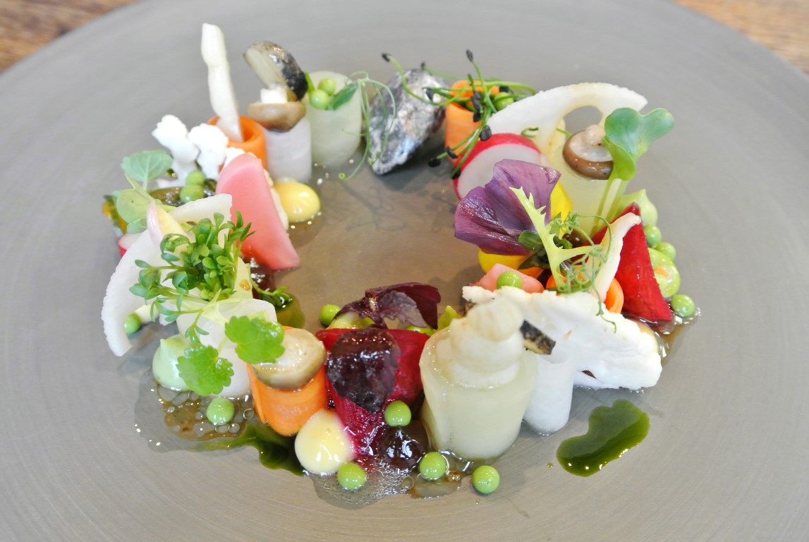 Auf den Krebs folgt das erste wahrhaftige Kunstwerk des Menüs, einem Gemälde gleich präsentiert sich der Stein und Gemüsegarten mit Yuzu-Miso-Granache & geeistem Koriander. Jede Gemüsesorte ist auf japanische Art eingelegt, ihre knackigen Texturen erhalten durch den kühlen Koriander eine gigantische Frische. Und der „Stein“, die Aroma-Skulptur aus Yuzu und Miso, ergänzt das Gericht auf beglückende Weise.