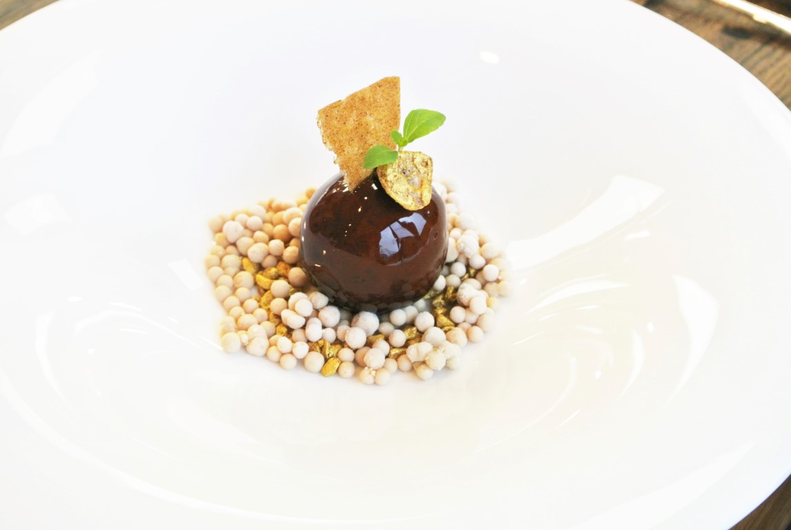 Nach dem Tag am (Japanischen) Meer erhält der Gast den ersten fleischlichen Genuss. Bau serviert Gänseleber aus der Landes. Es handelt sich um eine Praline, die mit Arabica Café überzogen ist und als Kern eine Haselnuss in sich trägt. Das gute Stück thront auf einem Bett aus Perlen, ebenfalls aus geeister Gänseleber, in dem sich vergoldete Haselnüsse verstecken.