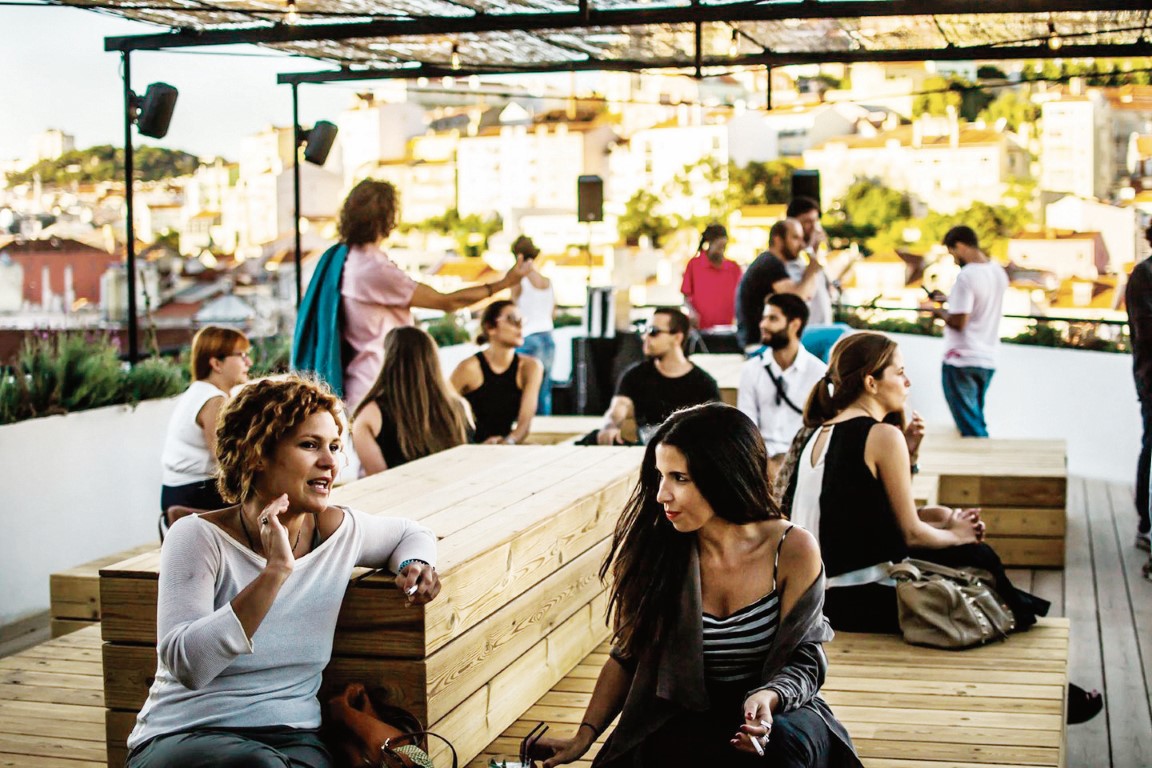 Spätnachmittags, wenn die Sonne tief steht und die Silhouette der Stadt in Pastelltöne getaucht wie ein impressionistisches Gemälde anmutet, empfehlen sich Rooftop-Bars wie das TOPO (www.topo-lisboa.pt). Unscheinbar am Dach eines alten Einkaufzentrums gelegen, eröffnet es bei DJ-Klängen und Cocktails einen traumhaften Blick auf die Festung und den Praça Martim Moniz. Bei Sonnenuntergang oder nach dem Dinner trifft sich hier internationales Publikum jeden Alters. Abends zieht es die Einheimischen, die viel und gerne ausgehen, ins Viertel Bairro Alto. Traditionelle Kneipen, Tascas, in denen Fado gespielt wird, reihen sich an schicke Bars und Clubs, Designer- und Plattenläden.