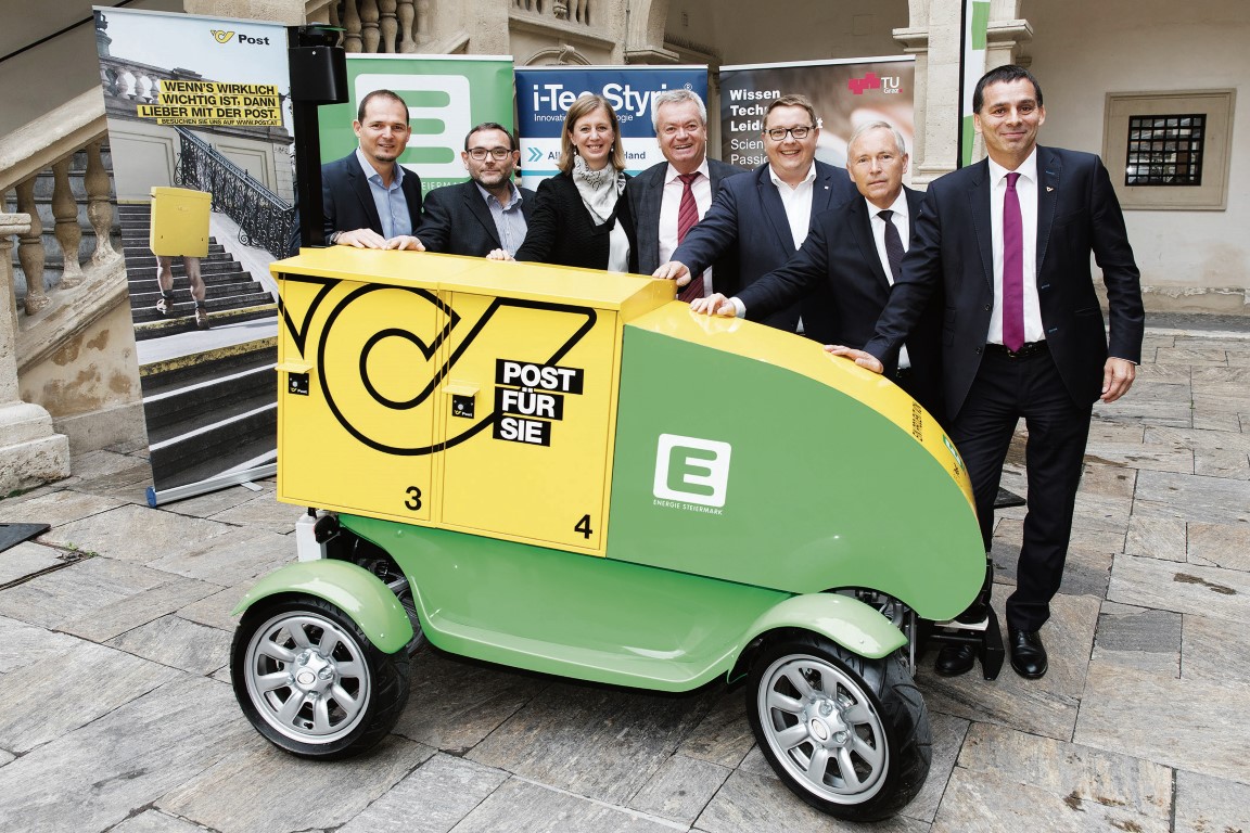 Die Energie Steiermark ist bei verschiedensten Forschungsprojekten Partner. So auch bei einem Projekt der Technischen Universität Graz, bei dem in Kooperation mit der Post AG ein „E-Post-Roboter auf Rädern“ entwickelt wird. „Diese Innovations-Partnerschaft mit der Post eröffnet neue Möglichkeiten, die wir ganz offensiv entwickeln wollen“, so Christian Purrer. Ende Oktober wurde der grün-gelbe E-Post-Roboter erstmals der Öffentlichkeit vorgestellt. Er fährt in Schrittgeschwindigkeit und ohne Fahrer zu unterschiedlichen programmierten Zielen in der Grazer Innenstadt. Vor der Haustüre informiert er die Adressaten per SMS über die Ankunft ihres Pakets. „Mit diesem Prototypen haben wir es geschafft, unsere Expertise in der autonomen Navigation von Robotern erfolgreich auf ein Elektrofahrzeug in einem städtischen Umfeld zu übertragen“, ist Gerald Steinbauer, Leiter der Arbeitsgruppe Autonome Intelligente Systeme vom Institut für Softwaretechnologie stolz.