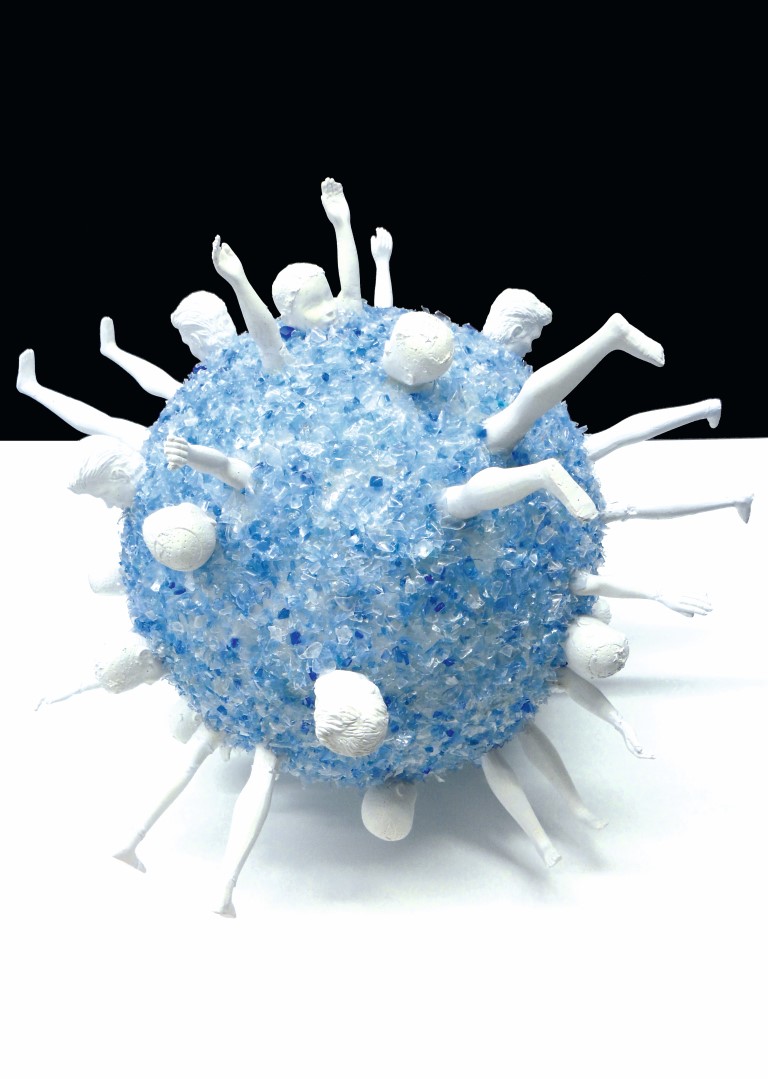 Mit dem Zyklus Erdkugeln taucht man ein in Axel Staudingers ironisch-spielerische Welt. Bestehend aus einer mit PET-Flakes ummantelten Glaskugel, die von innen „erhellt“ wird und kristallin in gebrochenen Lichtspektren schillert, wird die Erde zu einem fluoreszierenden Diamanten in der schwarzen Einöde des Weltraums. „Scheinen Köpfe und emporgestreckte Arme aus der Erdkugel ‚springen‘ zu wollen, so lassen die in die Kugel eintauchenden Beine gleichsam einen ‚Kopfsprung‘ zurück auf bzw. in die Erde vermuten. Letztlich sind diese Figuren aber hilflos Ertrinkende – im ‚Gold der Chemie‘, wie Axel Staudinger unsere Plastik-Wunderwelt nennt …“, so Kunstphilosoph Erwin Fiala.