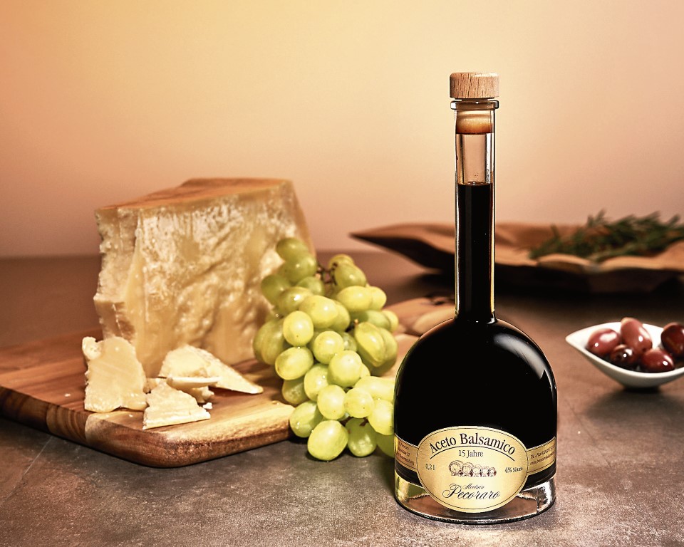 Weltmeisterlich sind unsere Nachbarn bei der Herstellung von Balsamessig, dem Aceto Balsamico. Original stammt er aus Modena, wo spätgelesene Trauben durch Kochen eingedickt und gefiltert werden, bevor sie in Holzfässern zur Reifung gebracht werden. Der Lagerungsprozess dauert im besten Fall Jahre, wobei der Balsamico durch Verdunstung des Wassers immer konzentrierter und dickflüssiger wird.
