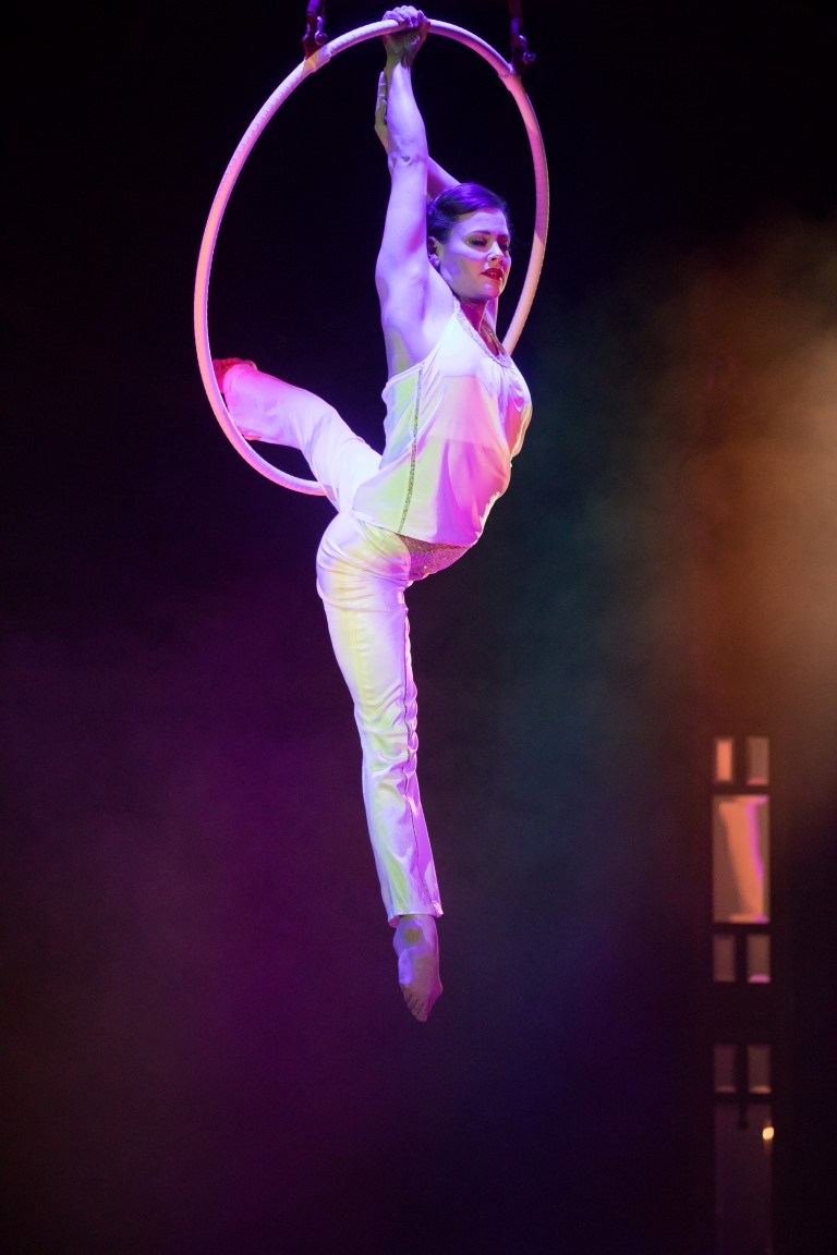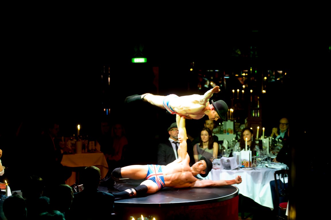Es ist, als betrete man eine andere Welt. Das mit Samtstoffen ausgekleidete Zelt leuchtet in sinnlichem Rot. Kristallene Luster hängen von der Decke und das Licht der Kerzenleuchter spiegelt sich in den gläsernen Wänden. In der Manege nehmen die Gäste an den festlich gedeckten Tischen Platz, während sich hoch über ihren Köpfen eine Akrobatin an einem Ring räkelt. Ein Duft nach feinen Speisen liegt in der Luft.