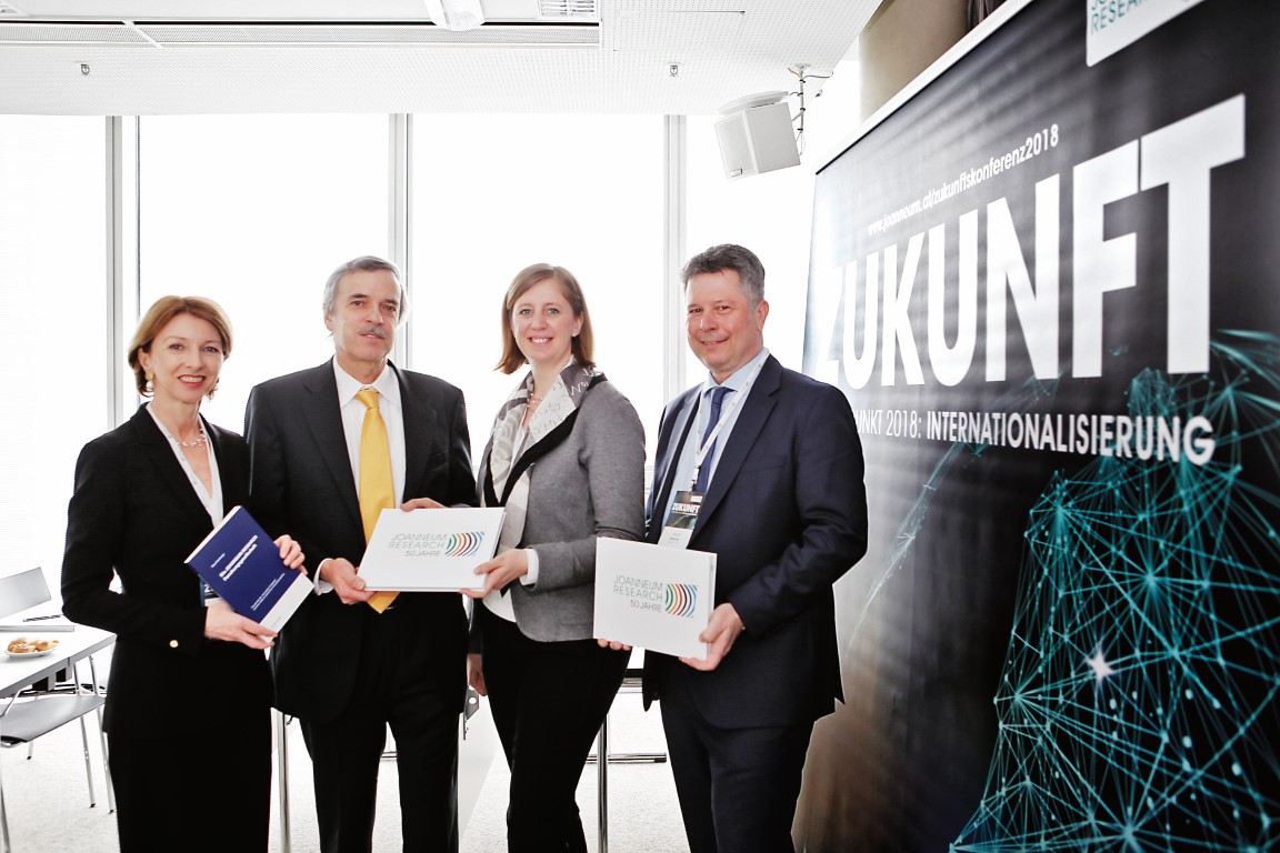 Aus der ehemaligen Leistungsschau in kleinem Rahmen ist die Zukunftskonferenz der JOANNEUM RESEARCH zu einer Veranstaltung mit internationalem Format geworden. Anfang März fand nun die achte Auflage im messe congress Graz statt. Rund 700 Teilnehmerinnen und Teilnehmern wurden spannende Vorträge, anregende Diskussionen und eine umfassende Ausstellung geboten. „Die JOANNEUM RESEARCH gestaltet die Entwicklung des Wirtschafts- und Forschungsstandortes Steiermark wesentlich mit und trägt dazu bei, dass wir heute das Forschungsland Nummer eins in Österreich und eine der innovativsten Regionen in Europa sind“, so die steirische Wirtschafts- und Wissenschaftslandesrätin Barbara Eibinger-Miedl im Rahmen ihres Besuchs. Erfreut zeigte sich auch die Kärntner Technologiereferentin Gaby Schaunig: „Ich bin beeindruckt von dieser großartigen Leistungsschau der JOANNEUM RESEARCH und stolz, heute als Vertreterin des Miteigentümers Land Kärnten dabei zu sein.“ Heuer präsentierten die Forschungseinheiten des Unternehmens – MATERIALS, HEALTH, DIGITAL, POLICIES, LIFE, ROBOTICS & COREMED – Forschung am Puls der Zeit vor globalem Hintergrund, denn „Internationalisierung“ war das umrahmende Thema der Konferenz. Als Hauptvortragender konnte DI Dr. Franz M. Androsch, Leiter F&E und Innovation der voestalpine AG, gewonnen werden. In seinem Vortrag sprach er über Strategien, die ein Unternehmen mit globalen F&E-Partnerschaften zum Erfolg führen.