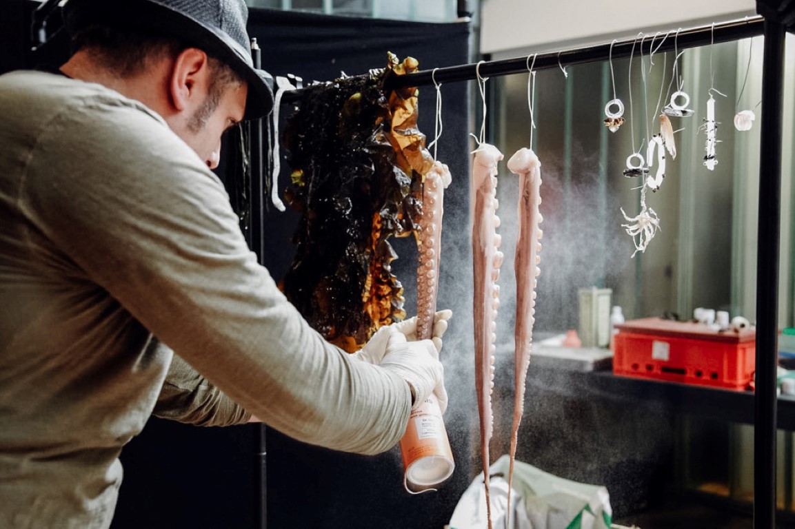 Bei Food Fashion agiert Trettl wie ein Modedesigner, indem er sensible Materialien wie Pasta, Salat, Tiefkühlerbsen oder Sepiatinte gekonnt auf dem menschlichen Körper in Szene setzt. Es gibt aber noch eine weitere Gemeinsamkeit mit großen Modekünstlern. Wie Karl Lagerfeld, Versace und Kenzo, die mit ihren Kollektionen für H&M High Fashion der breiten Masse zugänglich machten, stellte auch Trettl seine Künste weniger betuchter Kundschaft zur Verfügung. Für die Betriebskantinen von Sodexo entwickelte er 2016 die vegetarisch-vegane ­Menü-Linie Peter + Sillie. Hier zeigt er, dass gute Küche nicht nur von teuren Zutaten abhängig ist. Bei der Vernissage-Eröffnung am 11. August um 17 Uhr wird Roland Trettl persönlich anwesend sein und gerne auch Autogramme geben.