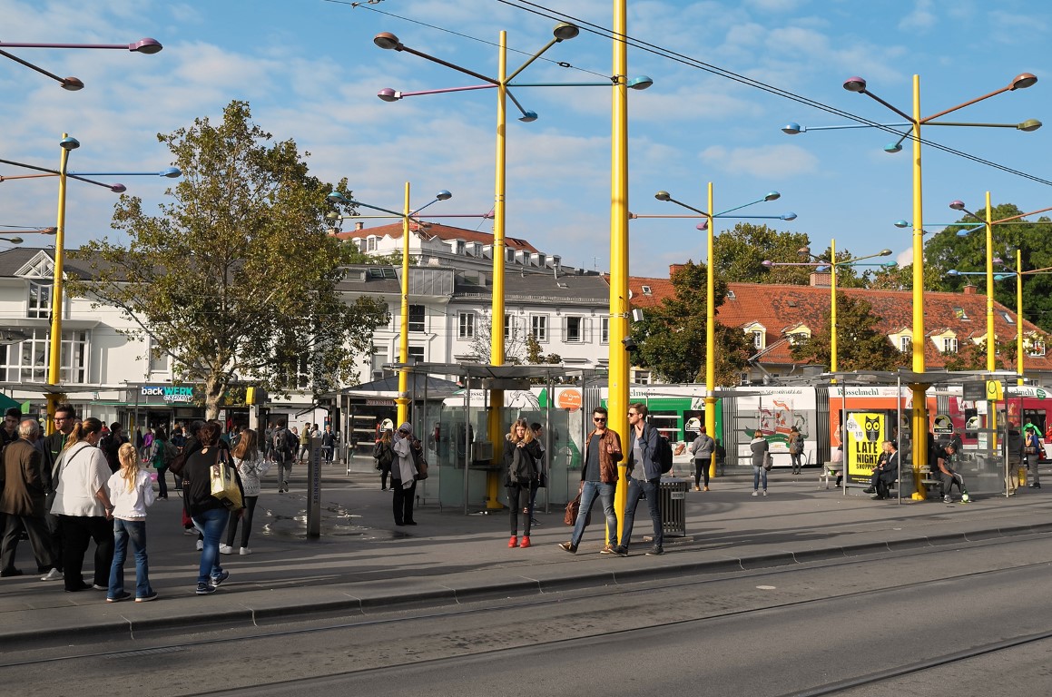 Jakominiplatz bis Karlauerstraße, Plüddemanngasse bis St. Peter Schulzentrum, Andreas-Hofer-Platz bis Dreierschützengasse. Wir kennen diese Orte. Unsere alltäglichen Wege haben uns mit ihnen vertraut gemacht, prägen unseren Blick auf sie. Doch treten wir einen Schritt zurück, können sich bei der Betrachtung dieser urbanen Räume neue Perspektiven auftun. Im Herbst 2017 dokumentierte Franziska Schurig fotografisch den Grazer Stadtraum entlang der Routen von Bus und Straßenbahn. In Dialog mit der Leitung des Graz­Museums, Otto Hochreiter und ­Sibylle Dienesch, bestand die Aufgabe der Foto­grafin darin, möglichst lakonische, neutral-­dokumentarische Aufnahmen zu erstellen. Ohne „interessante“ Perspektiven, ohne ironische „Pointen“ oder „kritische“ Kontextuierungen einer quasi „photographie parlante“. Entstanden ist die große Sommerausstellung Schau Graz!, die den Kern des diesjährigen urbanistischen Schwerpunkts im GrazMuseum bildet. Noch bis zum 10. September zeigt die Schau den gegenwärtigen Ist-Zustand von Graz als gesellschaftlich gewordenen Stadtraum: 426 Fotografien, die von allen im Stadtgebiet befindlichen Bus- und Straßenbahnhaltestellen aus aufgenommen wurden, ermöglichen neue oder alternative Sichtweisen auf vertraute urbane Orte. Und laden die Besucherinnen und Besucher dazu ein, über ihre Rolle als Stadtnutzerinnen und Stadtnutzer zu reflektieren.