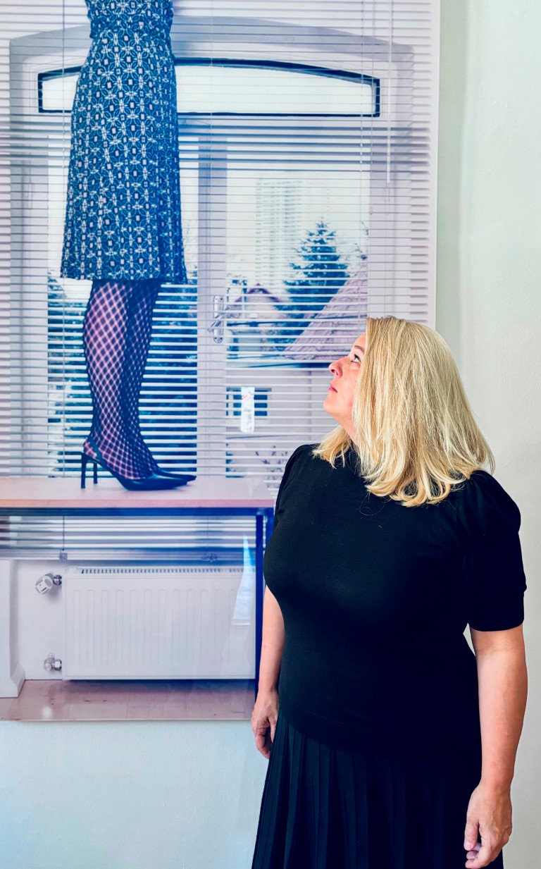 Kulturstadträtin Claudia Unger vor dem Werk „Hohe Erwartungen“ von Martin Osterider