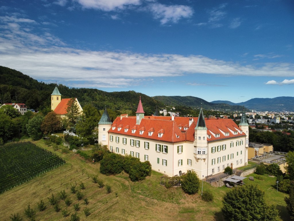 Stimmen treffen Bilderwelten: Im Bildungshaus Schloss St. Martin, über dem in den Sommermonaten eine Klangwolke schwebt, werden Besuchende in wechselnden Ausstellungen niederschwellig mit zeitgenössischer Kunst konfrontiert.