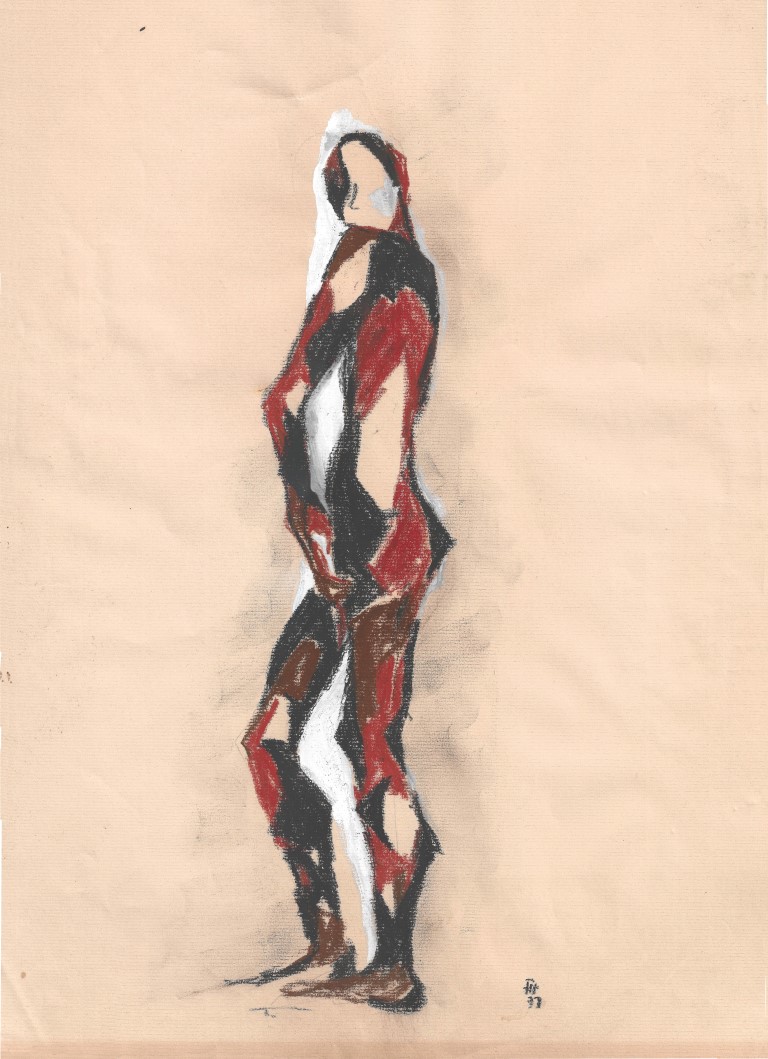 Das Frühwerk der Zeichnungen von Hortensia entsteht aus einer inneren Notwendigkeit. Zu Beginn verbinden sich in ihrer Bildsprache eine sinnliche Körperauffassung mit einer expressiven Linie und einer starken Kontur. Geometrisch strukturierte Kompositionen, intensive Farbigkeit sowie markante Hell-Dunkel-Kontraste verbinden sich mit gefühlsstarker Tiefe. Unbeschwerte, lustvolle Motive stehen neben dunkleren, nach innen gerichteten Stimmungen. Der Wunsch nach Freiheit und großer Offenheit prägt diese frühe Phase. Mit dem Studium in Wien vollzieht sich eine klare Zäsur. Hortensia beschäftigt sich intensiv mit alten Meistern wie auch mit Vertretern der Moderne. Sie alle werden zu Bezugspunkten in einem wachsend präzisen Vergleichssystem. Anstelle von subjektiver Expressivität haben in ihrer Zeichnung nun Form, Maß und Struktur oberste Priorität. Der Weg der Bildhauerin beginnt.